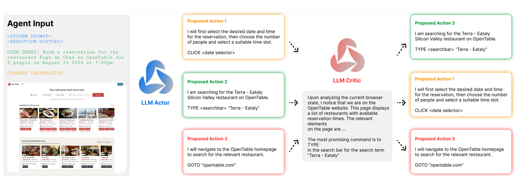 - 策略(Actor)提出动作:在当前网页状态(Agent Input)下,主模型(LLM Actor)生成多个可能的下一步动作。
