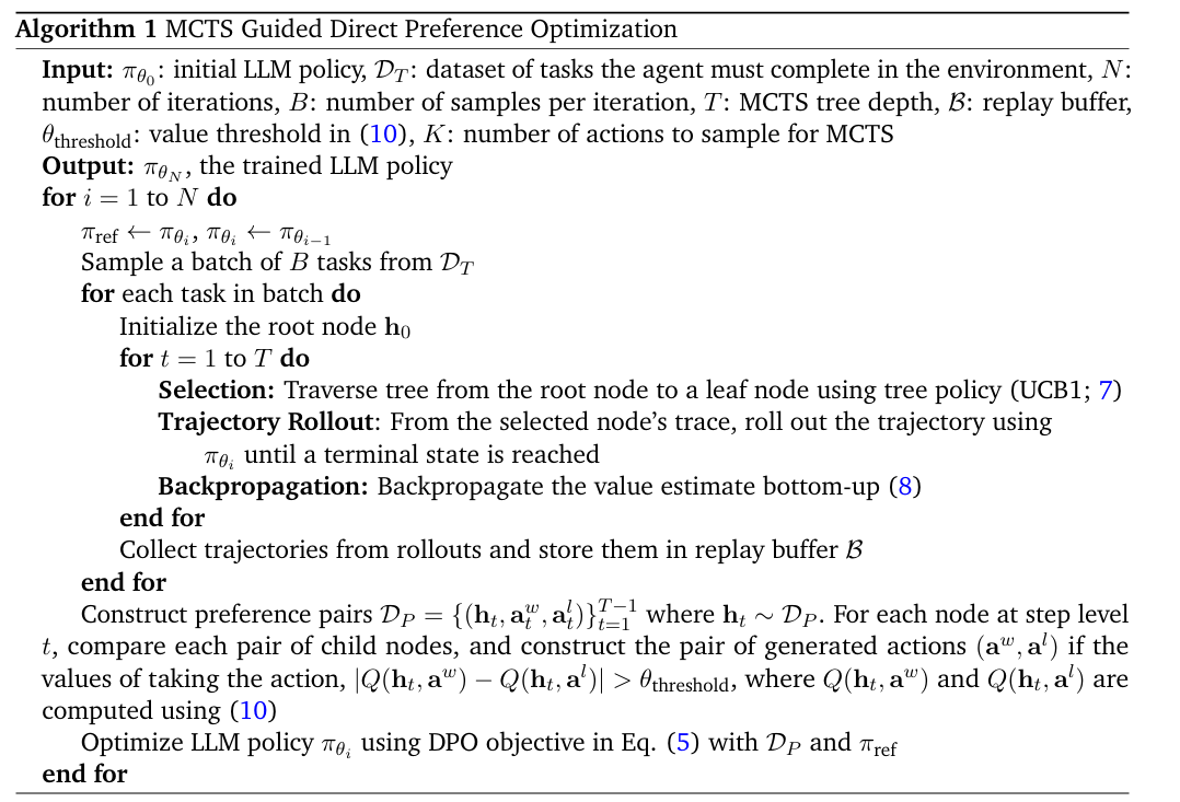 这个算法是Agent Q框架的核心,它将MCTS搜索和DPO训练紧密地结合在一起,形成一个迭代优化的闭环。它的主要目标是利用MCTS探索产生的“经验”来不断改进LLM策略。