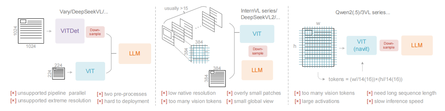 目前主流的VLMs为了缓解这个问题,使用了如双塔架构、基于分块的方法和自适应分辨率编码等架构,但都仍然存在着不足,例如Vary等双塔架构难以支持 pipeline parallel,基于分块的方法和自适应分辨率编码都会生成过多的vision tokens,或者激活内存消耗极大,引发GPU显存溢出。