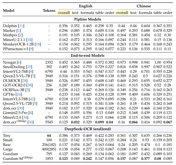 实验把当前OCR模型分为3类。第1类是传统的OCR模型,是多步骤的pipeline,比如第一步做layout detection(哪些地方有文字,哪些地方是图表),第二步是对每个部分做文字识别,这里每一步都可能出错,且上一步的错误可能会影响下一步的精度。第2类是end2end的主流的VLM,其中表现最好的是小红书的dots.ocr。第3类就是DeepSeek-OCR系列模型。