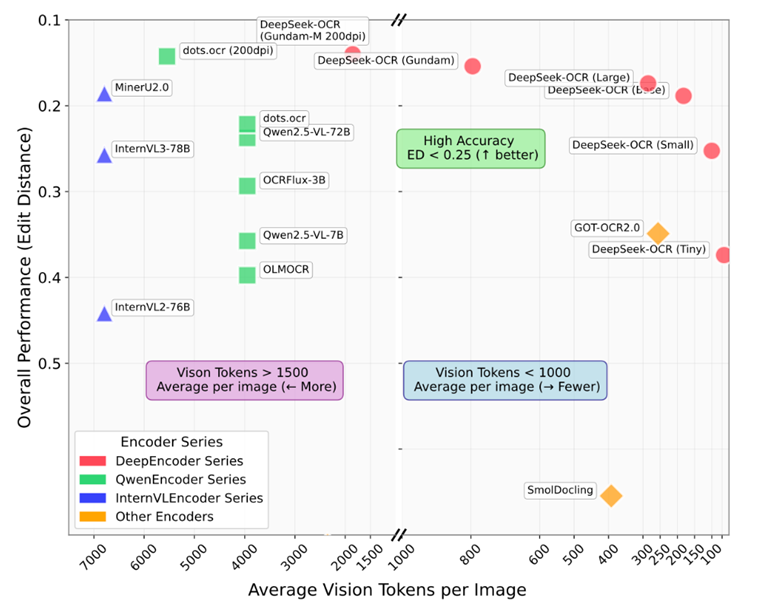 下图横坐标表示平均使用的tokens,越靠右越少;纵坐标表示模型的表现(edit performance),越往上越好。DeepSeek-OCR虽然性能上没有非常夸张地超过SOTA,但是它能以更少的vision token 达到近似或以微弱优势超过主流 OCR 模型的精度。