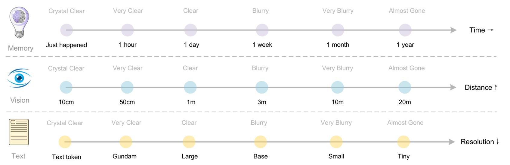 讨论:对于最近的对话,可以把它转换为较高分辨率的picture;随着对话的进行,该对话逐渐变得古老,我们可以压缩这个古老的picture,为memory腾出更多的空间。这就类似于人类的记忆,对于刚刚发生的事情还能记住很多细节,而童年的回忆只剩下一个模糊的轮廓。