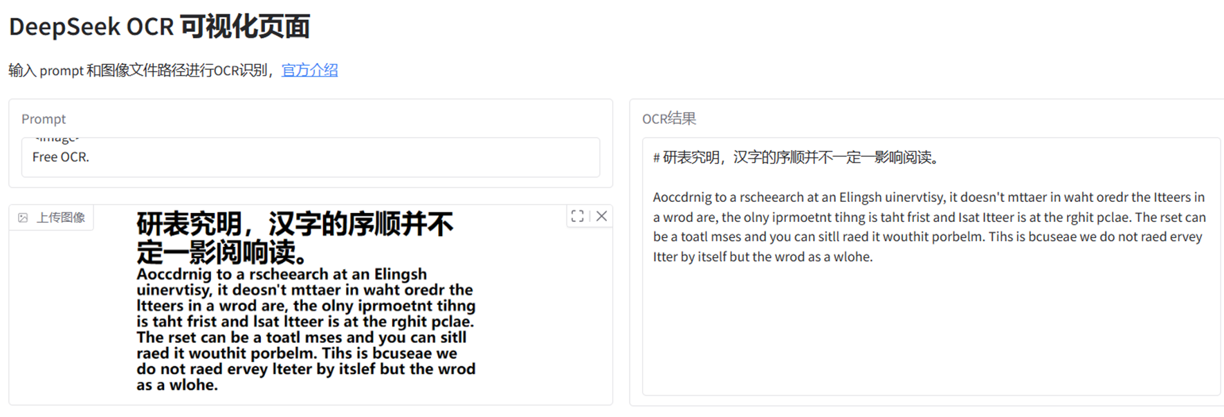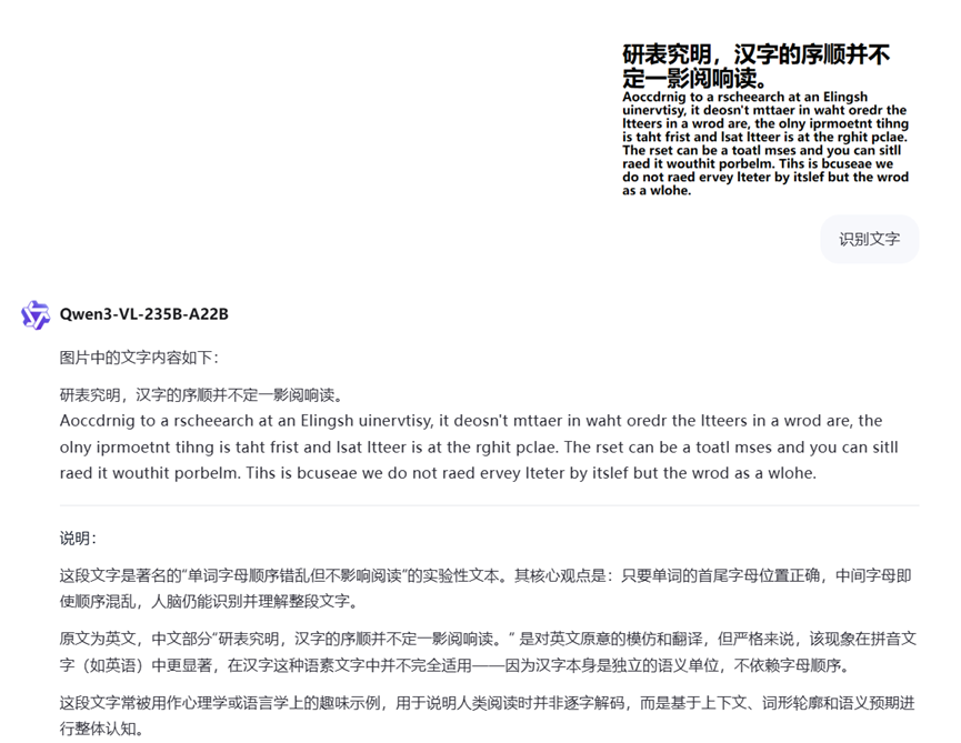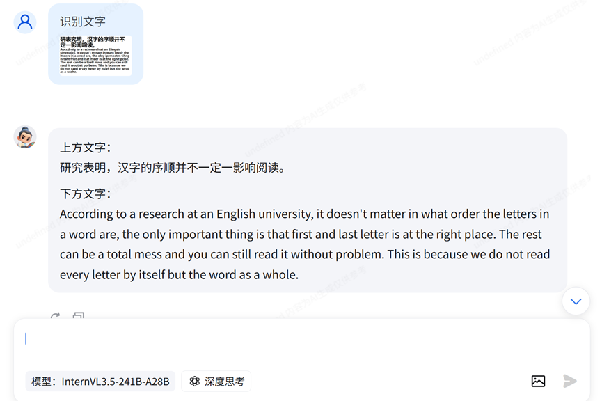 我在使用deepseek-ocr的时候发现,输入的图片内容是“汉字的序顺并不定一影阅响读”,但是OCR的推理结果是“并不一定一影响阅读”。在InternVL上也会出现类似的情况(见后),这或许是end2end的OCR模型都存在的问题:不仅是识别字符,还包括了语言理解或者纠正机制。我个人觉得这是decoder在自动补全语言信息的体现。